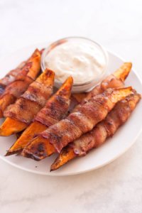 Az édesburgonya gumóit hámozzuk meg és alaposan mossuk meg. Vágjuk olyan nagy szeletekre amire kényelmesen rátekerhetünk egy szelet szalonnát. Lehetőség szerint kb. ujjnyi vastagságúak legyenek a cikkek. Tekerjük rá a bacon-t és tegyük egymás mellé sütőpapírral bélelt tepsibe.