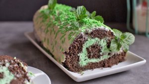 A mentás töltelékhez a porcukrot összekeverjük a megolvasztott vajjal, a tejjel és a mentával, majd a kihűlt tésztára öntjük, egy spatulával elosztjuk rajta. Feltekerjük és félórára a hűtőbe tesszük, hogy megdermedjen.