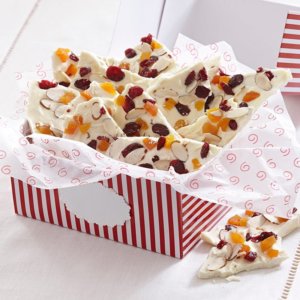 A kockára tördelt fehér csokit gőzfürdő felett megolvasztjuk, majd hozzákeverjük az szeletelt mandulát, kókuszchipset, aszalt gyümölcsöket és a gyömbért.
