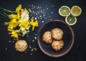 Egy tálba tesszük a liszteket, a cukrot, a tojásokat és a vajat a vaníliás cukorral. Belereszeljük egy fél citrom héját, valamint a szeletelt mandula kétharmadát.